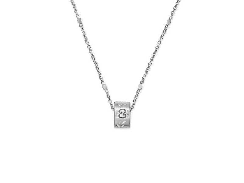 The iconic GG monogram – the two intertwined GG inspired by the initials of the founder of the company Guccio Gucci – was created in the 1920s and then introduced as an ornamental motif in the late 1960s in a reissue of the original diamond-shaped print. New interpretation of the Icon necklace with large pendant in 18Kt gold engraved with double G motif and floral decoration in white enamel.