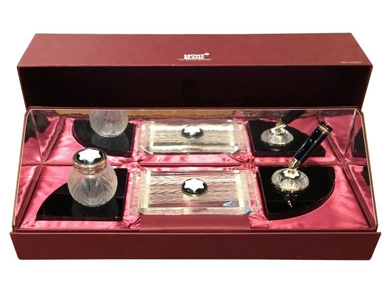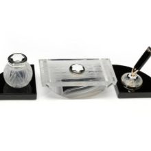 The Lalique Glass and Crystal Works established its reputation as the preeminent maker of fine art glass during the Belle Epoque. The acclaimed company collaborated with Montblanc, the world’s foremost maker of fine writing instruments, to create this limited edition set of writing accessories in crystal with gold-plated sterling silver accents. The set comprises a fountain pen holder, an inkwell and a rocker-style blotter. The set was issued in 1991, a year before the first Patron and Art and Writers Series releases, making this one of the earliest Montblanc limited editions. Outer box, display box, booklet, certificate of authenticity card. Limited Edition: 1070/4810.