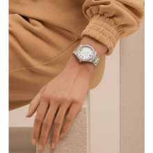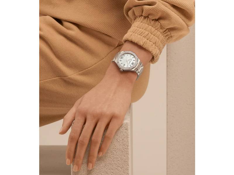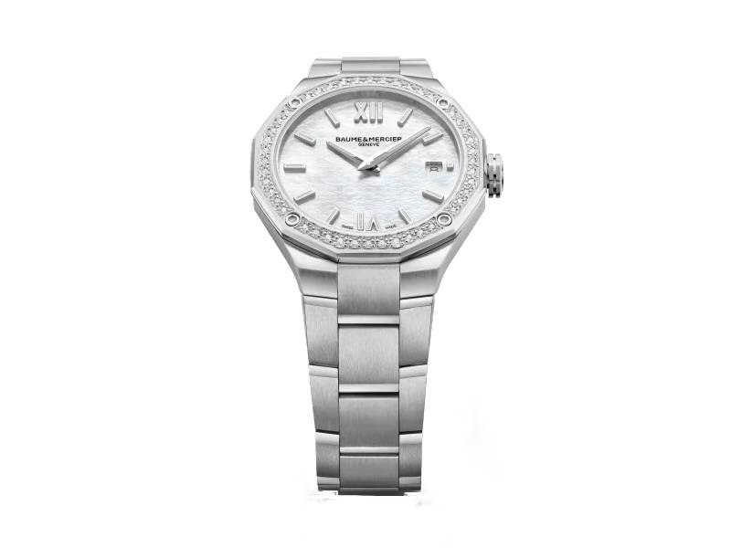 In a 36 mm diameter, Baume & Mercier presents another ultra-feminine Riviera in 2022, featuring a quartz movement, a white mother-of-pearl dial, an integrated steel strap, and a bezel set with 44 diamonds in a snow-setting style, fastened with four screws in polished steel. In this version, the Riviera addresses women seeking a precious watch that is smart, beautiful and simple. An understated luxury that the Maison perfectly masters.