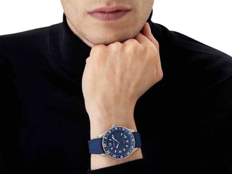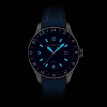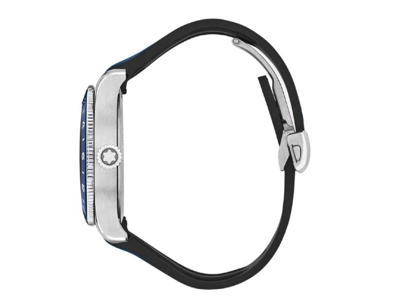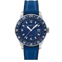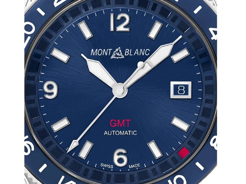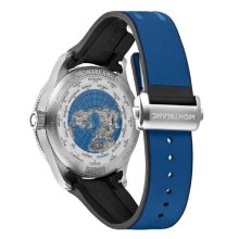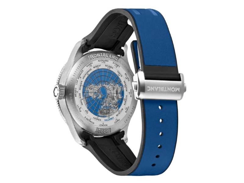 Where most GMT timepieces indicate the second time zone with an additional hand, the Montblanc 1858 GMT presents its GMT indication without hands that is very intuitive and highly legible. The Montblanc 1858 GMT indicates the second time zone with a red square that moves around the outside of the dial. This red square is positioned next to a fixed black anodized aluminium bezel with a 24-hour clock. This system also indicates the half hours. Other functions include a date and central seconds hand. The timepiece is housed in a 42mm stainless steel case and comes with a blue sunray dial and an interchangeable blue rubber strap with fine adjustment system. An engraving on the case back shows the continents, oceans, and names of cities in each of the 24 time zones, offering a worldtime indication.