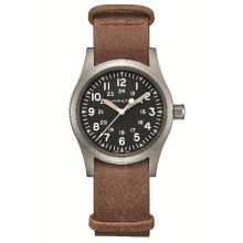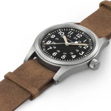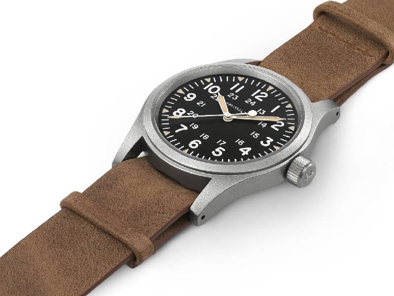 38 mm stainless steel case, three hand display, dark dial with light-colored numerals, triangular indexes with old radium color Super-LumiNova®, durable NATO strap: The new Khaki Field Mechanical is a faithful recreation of its original 1960s forebear and is true to Hamilton’s military heritage. This Hamilton leather strap is made from natural materials. The leather is tanned, but has not been treated, pigmented and finished in the same way as some other leather straps. This helps it to retain its natural look and also means that every piece is not exactly the same. As a result, the color of the leather strap may differ from the color shown on the image.