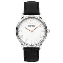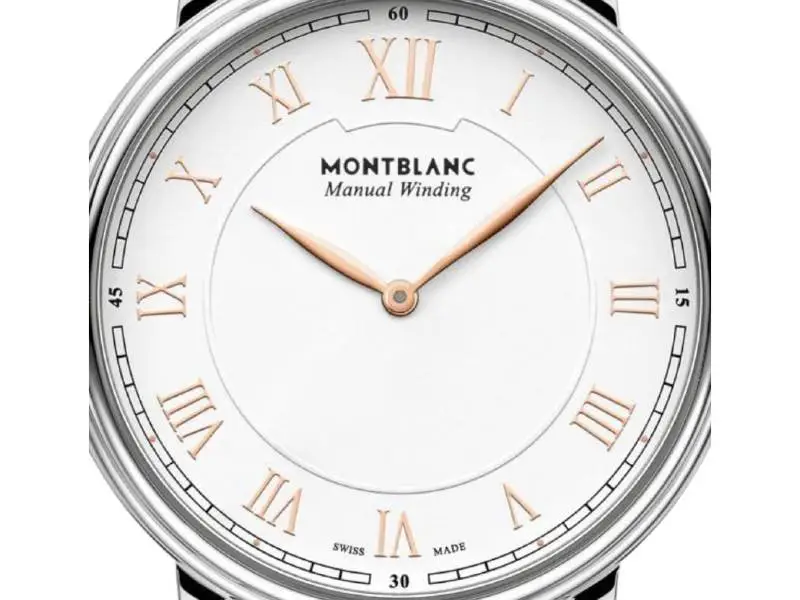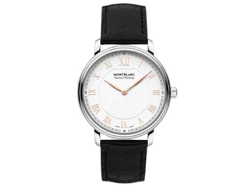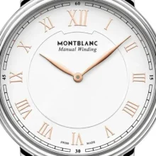 The Montblanc Tradition Manual Winding boasts both a distinctive Montblanc design expression as well as classic watchmaking codes. The timepiece is powered by Montblanc’s MB 23.01 manually wound movement. The 40 mm stainless steel case features the typical Montblanc straight horns and a distinctive double-shaped bezel with domed sapphire crystal. The design expresses classical watchmaking codes, such as the silvery-white dial with Roman numerals and a prominent Roman “XII”. The traditional railway minuterie and the classic leaf-shaped and baton-shaped hands complete this elegant appearance.