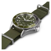 Sized to fit almost any wrist, the 37mm Khaki Navy Scuba Quartz features a total green look, with its unidirectional bezel made of aluminum, ultra-readable dial and a NATO textile strap. The hands and hour indexes on the deep military green dial are treated with Super-LumiNova® for optimal legibility. Appealing and ubiquitous, the green colorway adds an edge to the Khaki Navy Scuba, making it a timeless companion for any challenge, from aquatic explorations to urban adventures.
