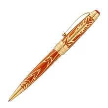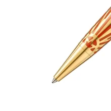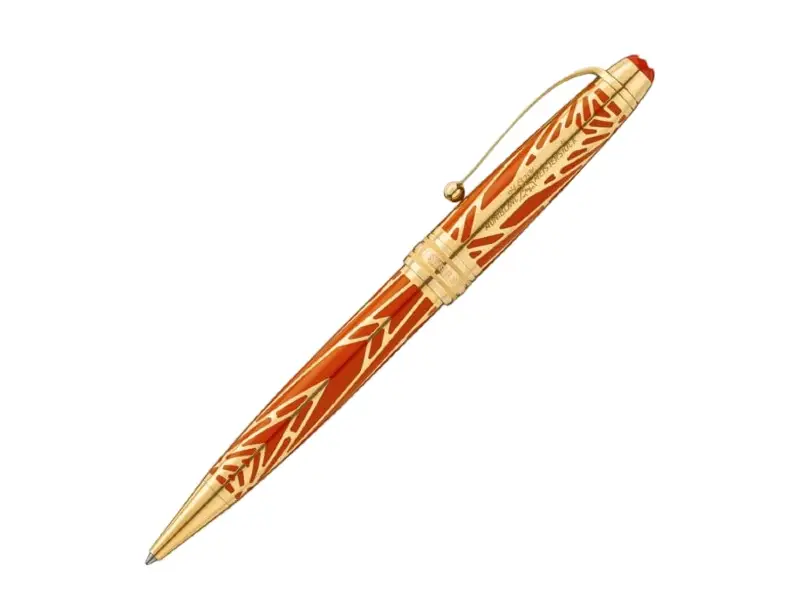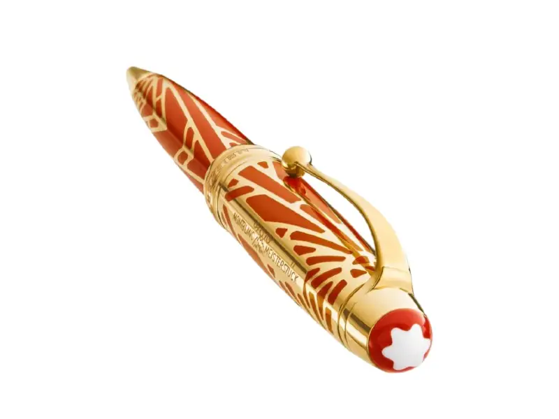 Barrel: The intricate pattern on the gold-coated cap and barrel, partially coated with coral-coloured lacquer, harks back to an unreleased design that had been hidden away for decades, giving Montblanc the opportunity to finally introduce this long-forgotten design reminiscent of the Art Déco period.