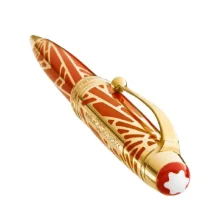Cap: The intricate pattern on the gold-coated cap and barrel, partially coated with coral-coloured lacquer, harks back to an unreleased design that had been hidden away for decades, giving Montblanc the opportunity to finally introduce this long-forgotten design reminiscent of the Art Déco period.