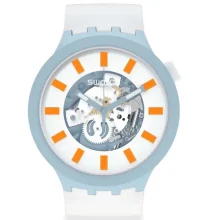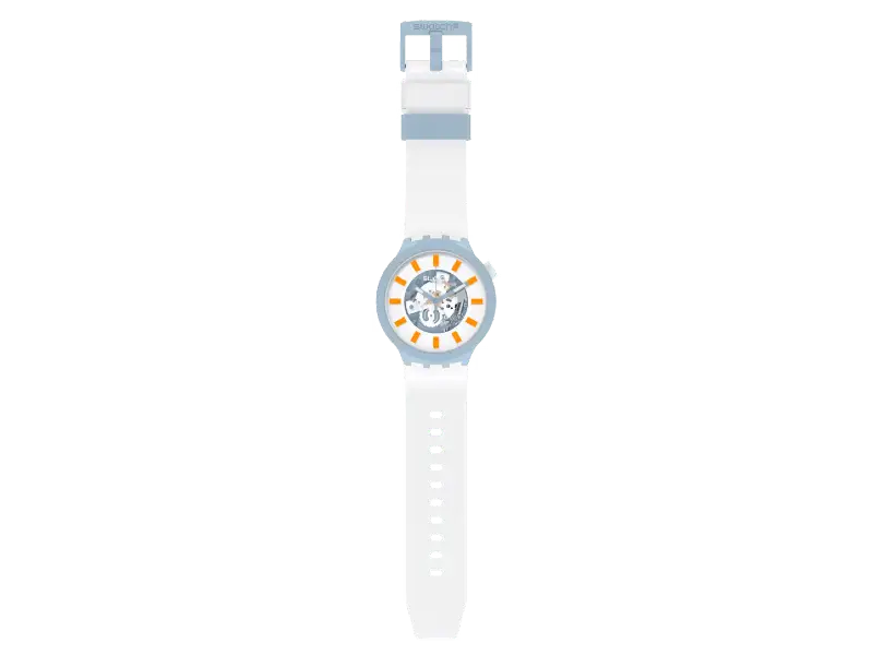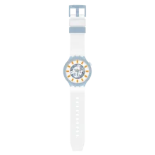 Un cinturino bianco opaco e occhielli di colore blu in materiale di origine biologica spiccano su questa meraviglia in bioceramica. Un quadrante trasparente e lancette blu con Swatch Glow splendono davvero.