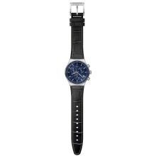 Sporting an all-new leather strap with a stamped alligator pattern and contrasting white stitching, this stainless-steel NEW IRONY CHRONO watch features a sophisticated dark blue face and engraved bezel in a brushed stainless-steel watch case with polished details.