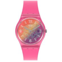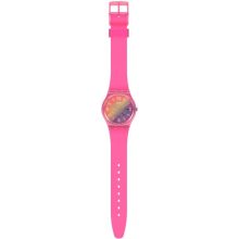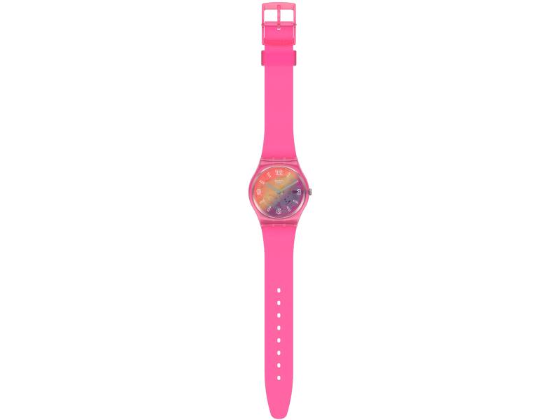 This colorful watch features a transparent matte pink silicone strap and shiny pink plastic case with a multi-colored gradient dial that truly pops.