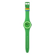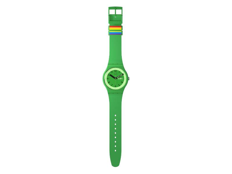 This Swatch Pride 2023 Special watch features a green-print dial and green biosourced glass with biosourced case. The hour and the minute hands are black, and the latter shows the meaning of the color green in the Pride flag: nature. The matching strap of this green watch includes two special loops that form the rainbow flag when united.