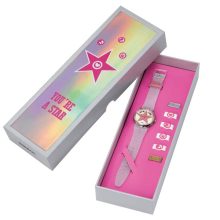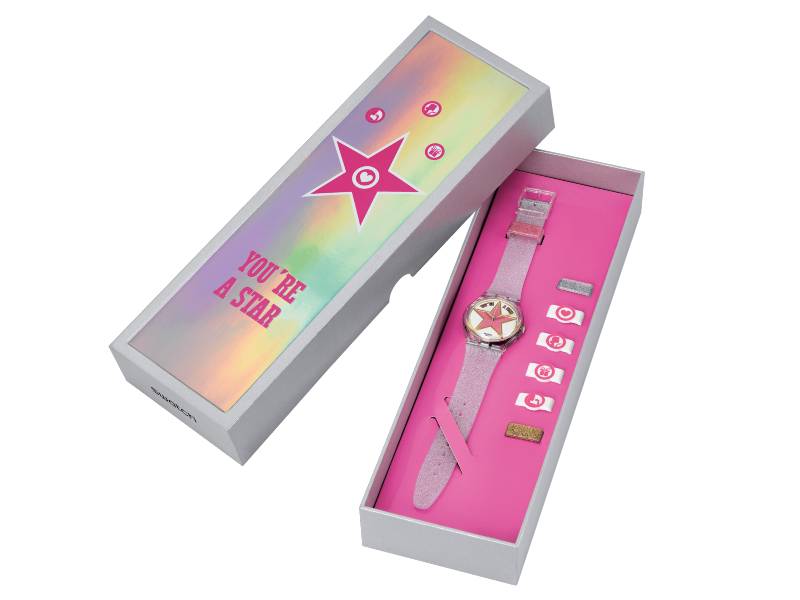 This Gent BIOSOURCED Mother’s Day Special watch celebrates moms as the stars of your life with a show-stopping dial, complete with a bold pink star and gold details: appliques, hands and “YOU’RE A STAR” print. A transparent shiny clear bio-sourced plastic case sits on a transparent silicone strap decorated with metallic-colored glitter loops and additional removable loops featuring a heart, a blowing kiss, a gift and a flexing muscle. This watch comes in a Hollywood-style reflective special packaging, honoring moms as the leading ladies they are.