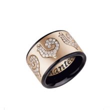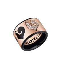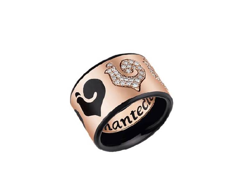 Anello fascia alta 15mm in oro rosa 18Kt, 3 galli con 60 diamanti incastonati a pavè e smalto nero.