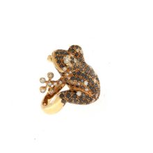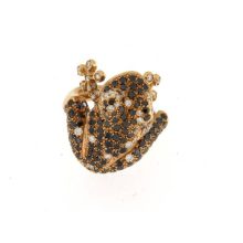 Anello a forma di rana in oro rosa 18kt con pavè di diamanti neri e bianchi.