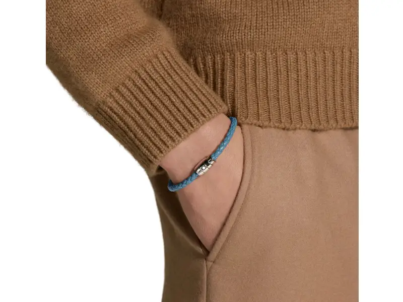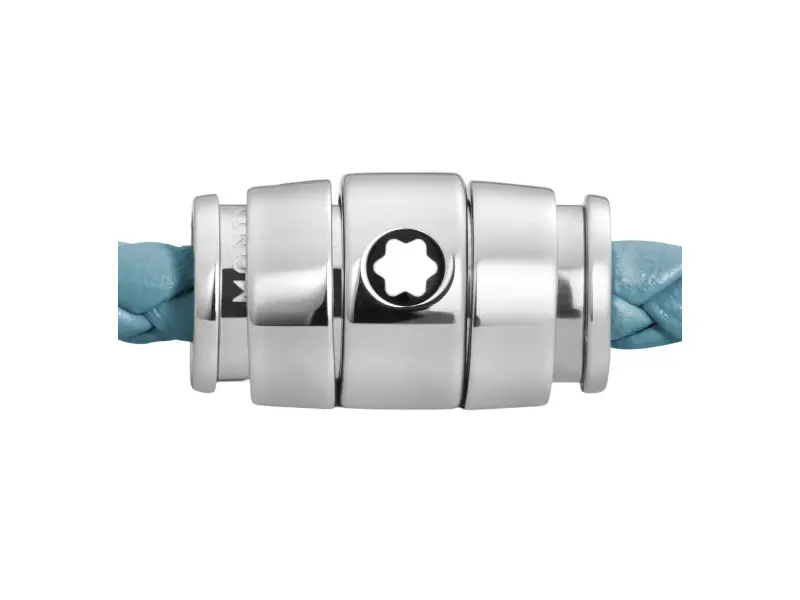 Questo gioiello, realizzato in pelle color blu fumo, è dotato di una chiusura in acciaio inossidabile lucido con emblema Montblanc.”.