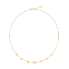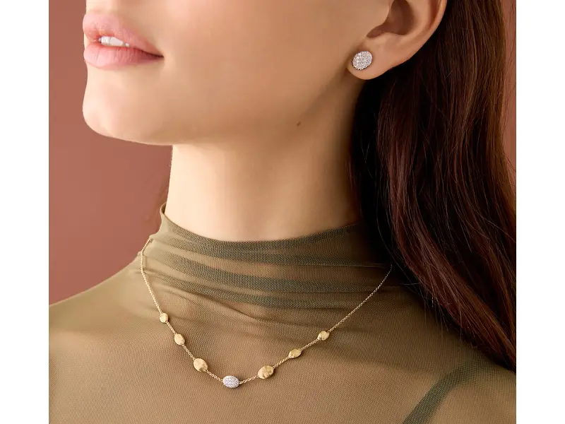 Una raffinato degradé di ovaline in oro giallo 18kt, finemente incise a mano con l’antica tecnica del bulino, è arricchito al centro da un elemento ovale interamente realizzato in pavé di diamanti taglio brillante che cattura la luce ad ogni movimento.