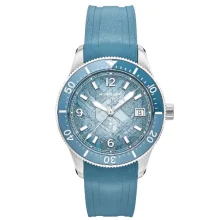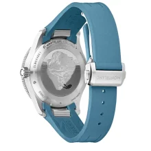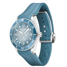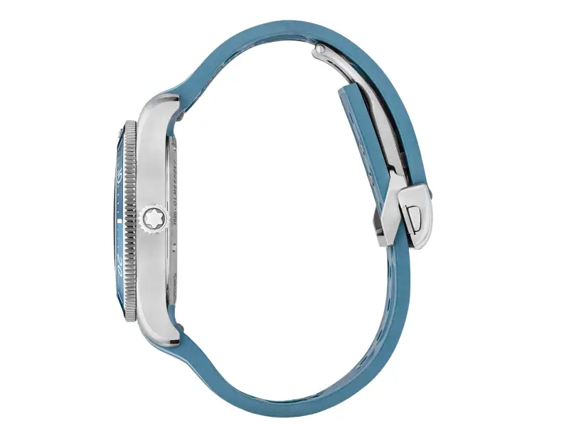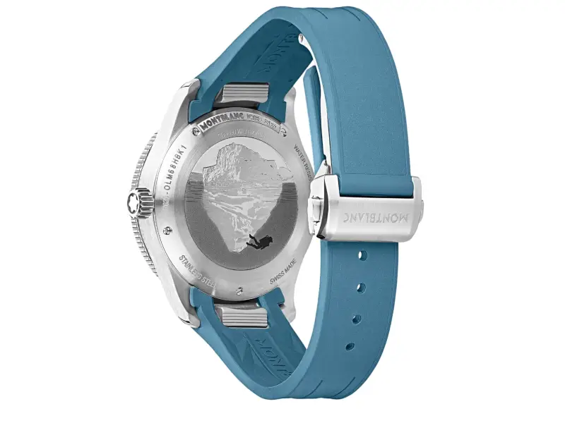 Il Montblanc Iced Sea Automatic Date 0 Oxygen con quadrante blu Sfumato con motivo “ghiacciaio” dà l’impressione di guardare nelle profondità di un ghiacciaio. Ispirata al Mer de Glace, questa texture glaciale è stata ottenuta utilizzando una tecnica ancestrale quasi dimenticata chiamata gratté-boisé. Il segnatempo è custodito in una cassa da 38 mm in acciaio pregiato totalmente priva di ossigeno con lunetta girevole unidirezionale con inserto in alluminio anodizzato bicolore blu, un’incisione 3D sul fondello e un cinturino intercambiabile in caucciù blu con regolazioni raffinate. Il segnatempo è conforme alla norma ISO 6425 relativa alle immersioni subacquee e offre un’impermeabilità fino a 300 metri.