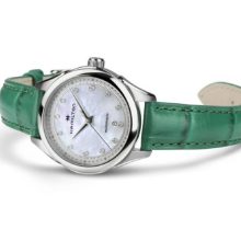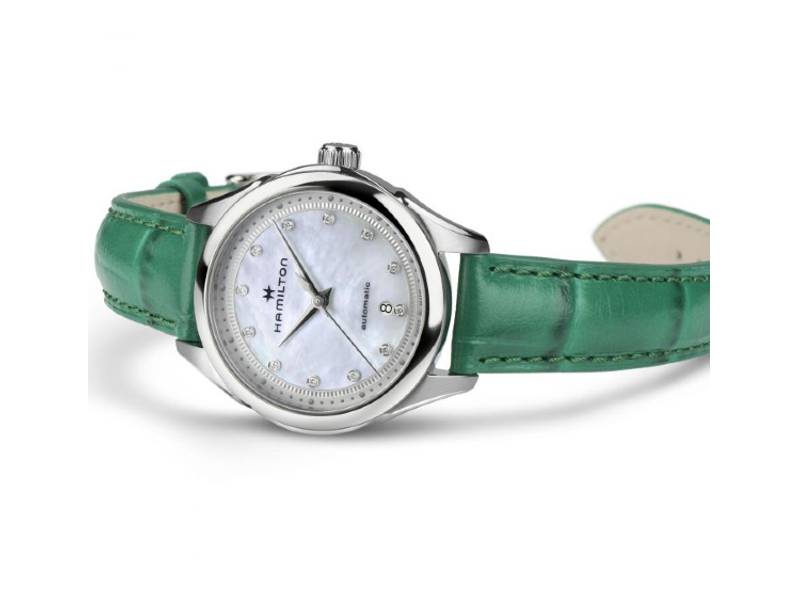 Il lussuoso cinturino in pelle verde con finitura in alligatore dona carattere al Jazzmaster Lady Auto. Caratterizzato da uno splendido quadrante in madreperla con 12 indici in diamanti e alimentato da un movimento automatico con 44 ore di riserva di carica, il segnatempo da 30 mm combina perfettamente uno stile audace con dettagli raffinati.