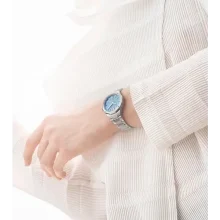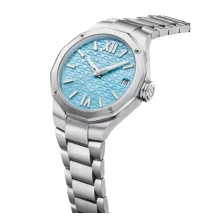 Il Riviera 10811 è impreziosito da un quadrante azzurro satinato soleil e da un decoro a onde trasparenti con numeri romani e indici rodiati rivettati rivestiti di Superluminova bianco. La cassa dodecagonale in acciaio inossidabile lucidato e satinato è dotata di corona libera ottagonale con logo Phi in rilievo. Il bracciale intercambiabile in acciaio inossidabile è dotato di un affidabile sistema di sostituzione senza attrezzi.