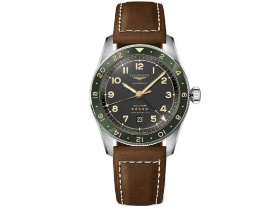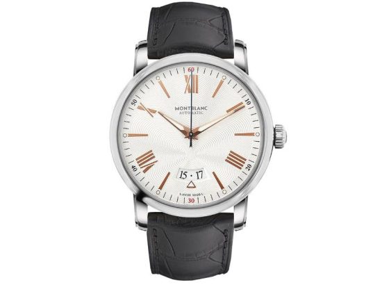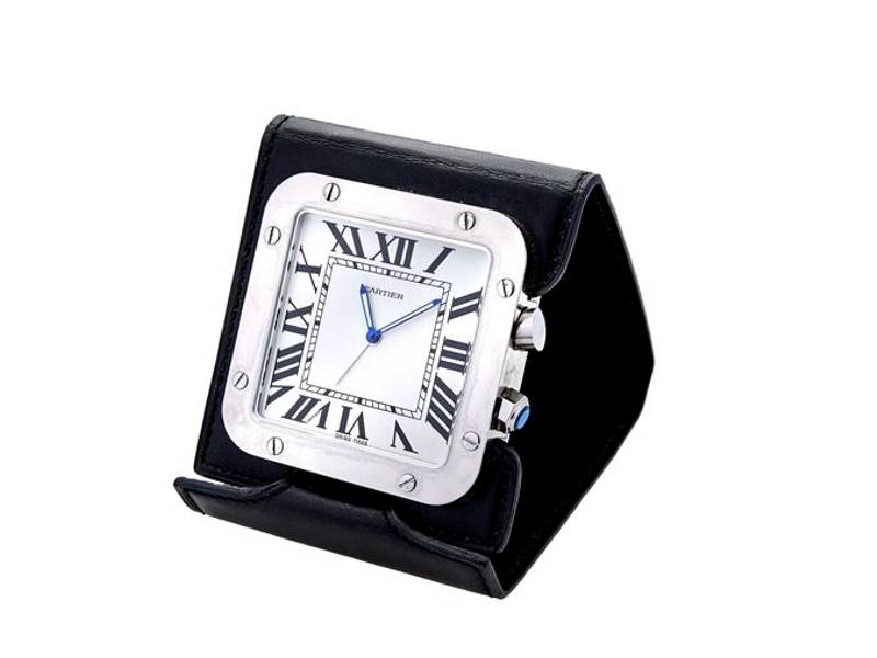Orologio sveglia da viaggio in acciaio con supporto in pelle nera.