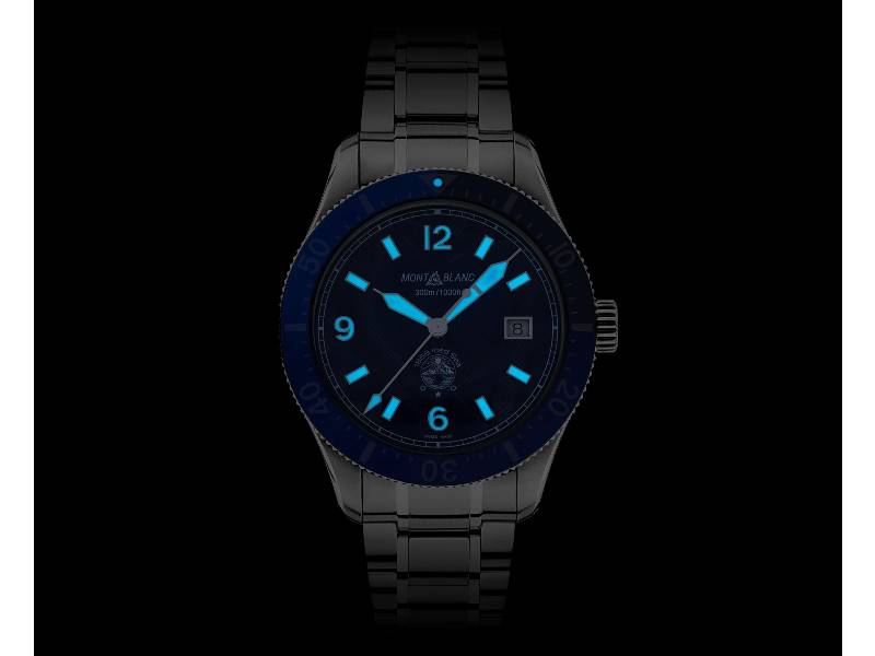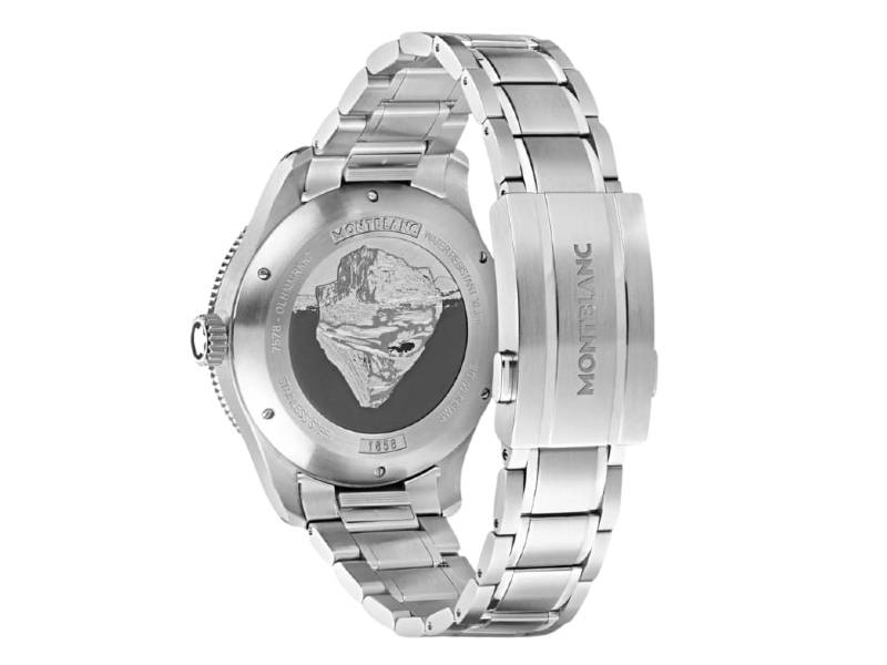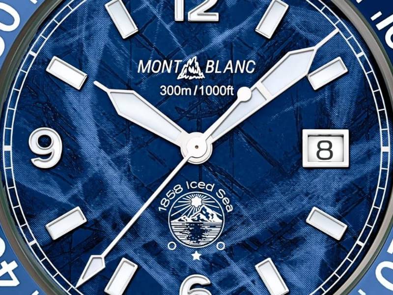 Il primo orologio da immersione sportivo di Montblanc, il Montblanc 1858 Iced Sea Automatic Date, presenta un quadrante con motivo “ghiacciaio” che dà l’impressione di guardare nelle profondità di un ghiacciaio. Questo quadrante blu con motivo “ghiacciaio” è ispirato al Mer de Glace (Mare di Ghiaccio), il ghiacciaio principale del Massiccio del Monte Bianco. La sua texture è stata ottenuta utilizzando una tecnica ancestrale quasi dimenticata chiamata gratté-boisé. Il segnatempo presenta inoltre una lunetta unidirezionale in ceramica bicolore, un fondello inciso e un bracciale conico in acciaio pregiato intercambiabile con regolazioni raffinate, per una vestibilità perfetta. Il segnatempo è conforme alla normativa ISO 6425 per gli orologi da immersione ed è impermeabile fino a 300 metri.
