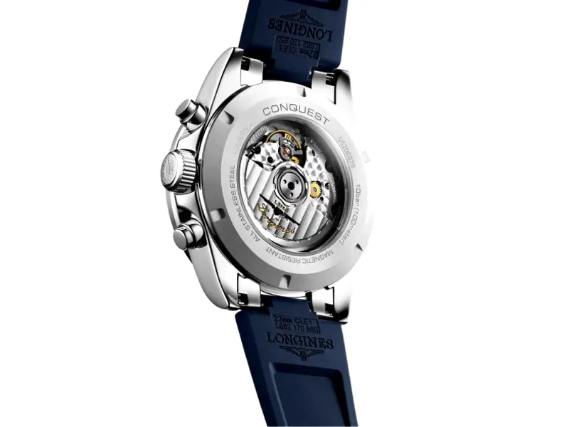 Calibro: L898. Movimento meccanico a carica automatica con frequenza di 28.800 alternanze orarie e riserva di carica di 59 ore.