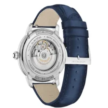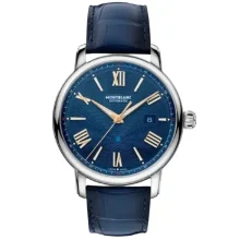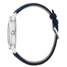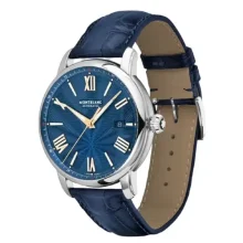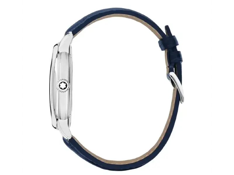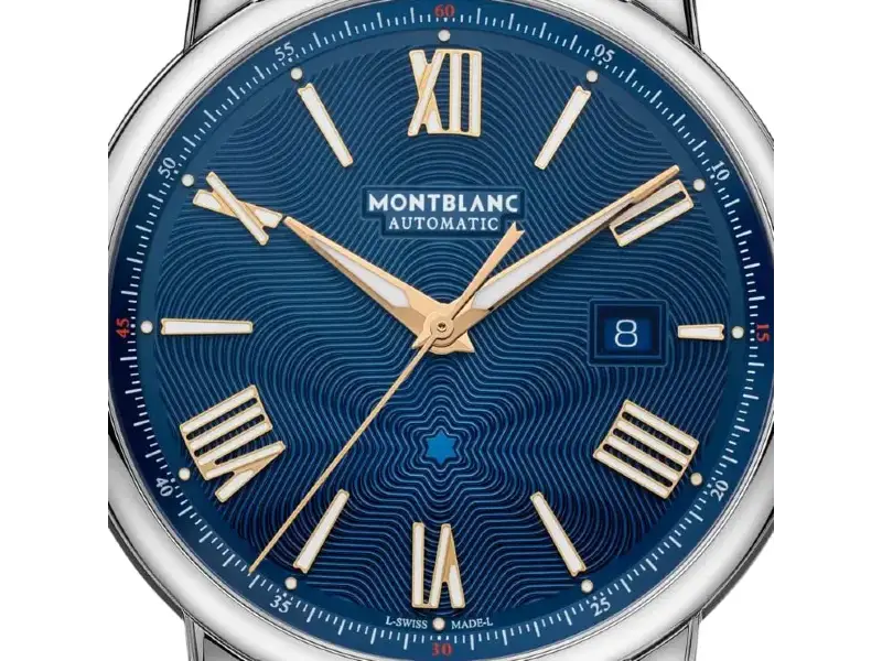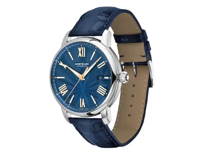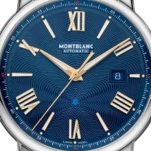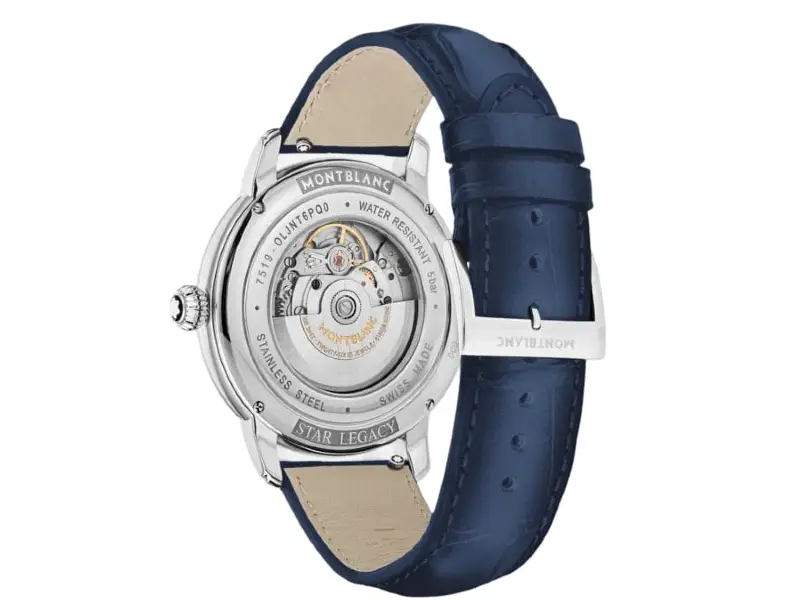 Il Montblanc Star Legacy Automatic Date in edizione limitata di 800 esemplari è impreziosito da un quadrante blu con l’iconico motivo a stella variabile Montblanc e con indici a forma di spada e numeri placcati oro rosa. È alimentato dal movimento automatico MB 24.17 che indica ore, minuti, secondi e data. In termini di design, il segnatempo si ispira agli orologi da tasca Minerva della fine del XIX secolo e inizio del XX con le loro casse rotonde, lucide e a forma di ciottolo e le corone a cipolla. Questo segnatempo è altresì dotato di un cinturino intercambiabile in pelle di vitello blu con stampa alligatore e impunture tono su tono.