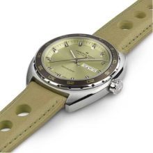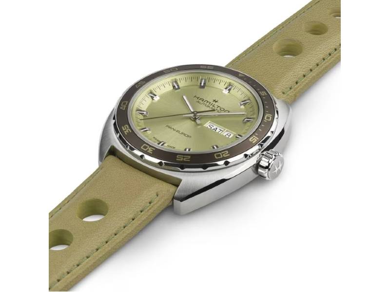 Fai un tuffo nel passato con questo Pan Europ Automatic da 42 mm dal design d’ispirazione vintage anni ‘60. In uno stile retrò che ben si adatta alla vita odierna, questo orologio presenta una cassa in acciaio a forma di cuscino con una lunetta girevole unidirezionale. Dotato del movimento automatico H-30 con una riserva di carica di 80 ore, il Pan Europ Automatic è il perfetto alleato per vincere la corsa contro il tempo. A completare il look, due cinturini intercambiabili: uno in tessuto intrecciato NATO marrone cioccolato e uno in morbida pelle traforata verde salvia, che richiama l’atmosfera delle corse automobilistiche degli anni ‘60.