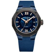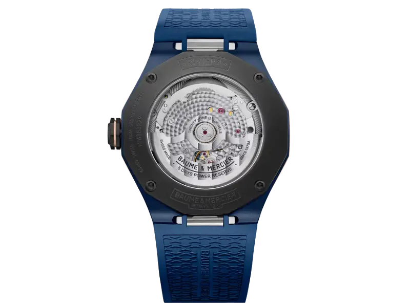 Il look sportivo del Riviera 10769 mutua dalla pietra le delicate tonalità sfumate, alle quali si contrappone il quadrante blu che richiama le profondità del mare. Questa declinazione del Riviera è racchiusa in una cassa dodecagonale di 42 mm di diametro. La raffinata maestria artigianale ne intensifica la luce, valorizzando i contrasti grafici di colori e indicazioni temporali. In questa versione bicolore, che abbina sobriamente il titanio e il PVD blu, il Riviera si impone in tutta la sua forza. Animato da un movimento Baumatic di Manifattura, il segnatempo garantisce precisione, durabilità e una riserva di carica di cinque giorni. Il cinturino integrato in caucciù blu con pattern tela può essere sostituito senza strumenti particolari grazie a un meccanismo affidabile e robusto.