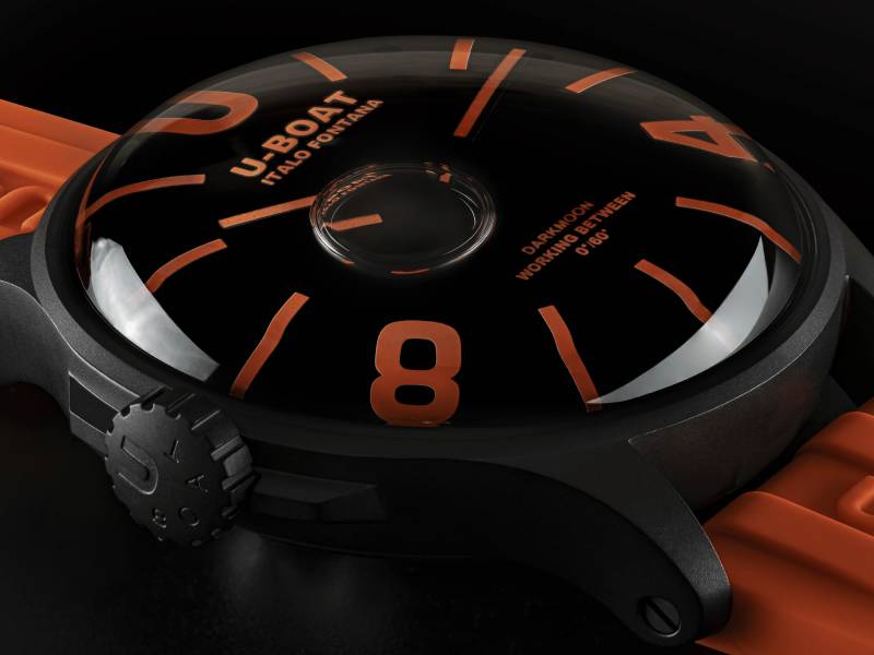 In misura 44 mm con un quadrante curvo per un effetto 3D amplificato. Movimento elettromeccanico immerso in bagno d’olio. Cassa in acciaio trattata PVD nero, quadrante nero, e numeri, indici e lancette trattati con luminova arancio.