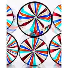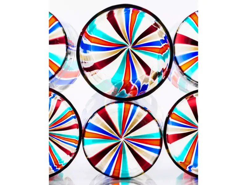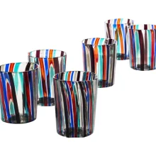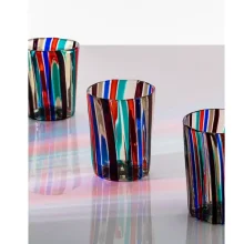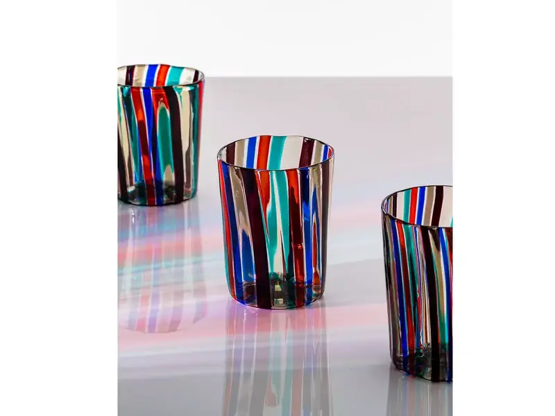 Un vero e proprio inno al colore, la collezione a canne nasce dalla riedizione di oggetti disegnati da Gio Ponti per VENINI in occasione della XXVI Biennale di Venezia del 1952 ed è composta da bicchieri, vaso e da una caraffa dalla silhouette elegante e slanciata, con una base che si assottiglia gradualmente verso l’alto, culminando con un beccuccio delicatamente curvo. La tecnica utilizzata è quella delle canne che prevede, in questo caso, l’accostamento di sei sottili strisce di vetro colorato a freddo Talpa, Rosso, Zaffiro, Verde, Paglierino, Ametista che vengono poi accostate, fuse insieme e plasmate a caldo con abilità magistrale, creando un effetto visivo vibrante e caleidoscopico. Questa tecnica offre una vivace varietà di tonalità e sfumature che conferiscono un aspetto vivace e dinamico