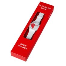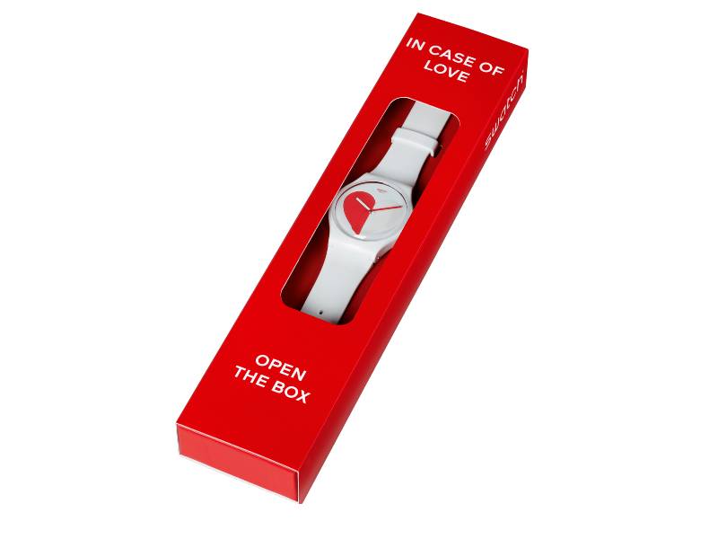 Questo orologio della collezione di San Valentino è contraddistinto da una robusta cassa bianca in plastica di origine biologica e da un cinturino bianco in silicone. Il quadrante bianco con le lancette rosse e bianche mostra un cuore dello Swatch rosso-bianco che si illumina al buio, specialmente nella parte bianca. Fornito all’interno di una confezione speciale.