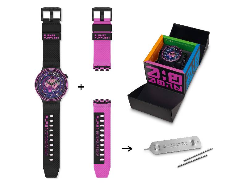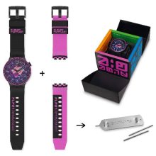 Accendi il tuo stile con i modelli dotati dei due cinturini biocompressi in silicone disponibili per questo orologio futuristico, caratterizzato da un effetto Swatch Solar Spectrum viola sulla cassa. Il quadrante trasparente con la sua stampa multicolore lascia spazio per il quadrante e le lancette, illuminate con Swatch Glow. Lo speciale dettaglio dell’astronauta rosa sostituisce la ruota motrice standard e potrebbe non essere posizionata come nell’immagine dimostrativa;