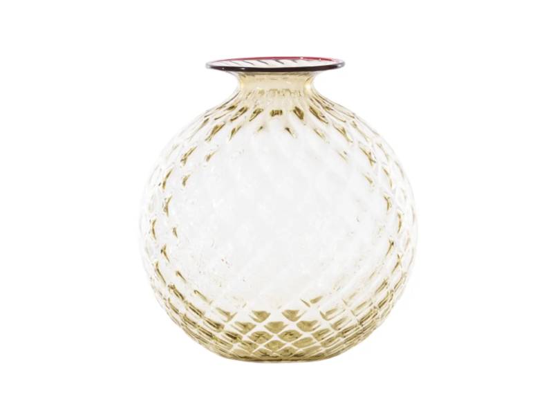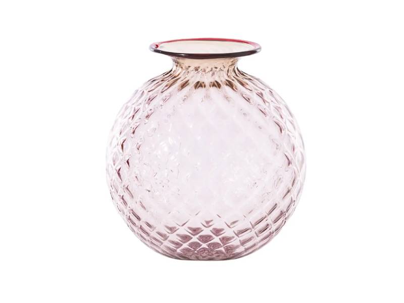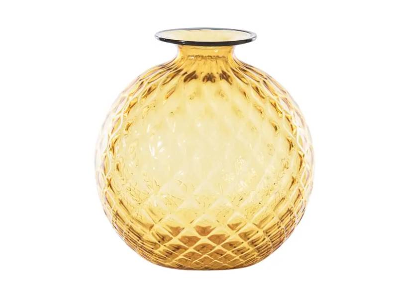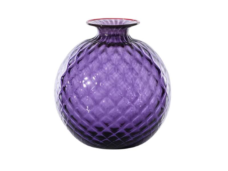 ““Sembra morbido, eppure è vetro. L’illusione ottica del Monofiori di VENINI del 1970 è nel suo nome: Balloton, la lavorazione unica che ricrea sulla superficie l’effetto matelassé. L’opera è lavorata a mano, soffiata nel caratteristico stampo in metallo e finita nel collo sottile con un filo colorato applicato a caldo, che varia nel colore.””