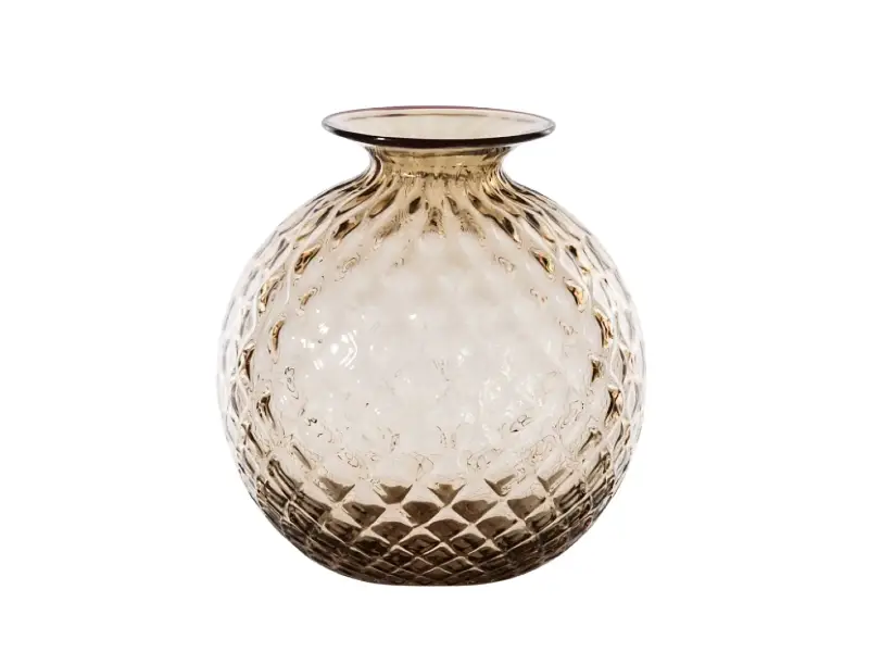 TECNICA BALLOTON: Per la tecnica del balloton il maestro si affida all’uso di uno stampo in metallo, con punte a piccola piramide dalla base quadrata lungo tutta la superficie interna della sua circonferenza. Nella soffiatura, il vetro ne riempie completamente il vuoto e restituisce un particolare effetto ottico di rilievo incrociato.