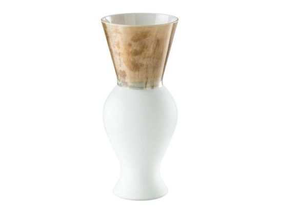 Dalla tela de «L’annunciazione della Vergine» di Paolo Veronese alla realtà della Fornace: è questo il magnifico viaggio del vaso di Vittorio Zecchin. Forma complessa, bombata oltre l’immaginazione: il Veronese sfida deciso la gravità, come nel quadro che originariamente lo ospita. E la sua bellezza vince su tutto a distanza di secoli.